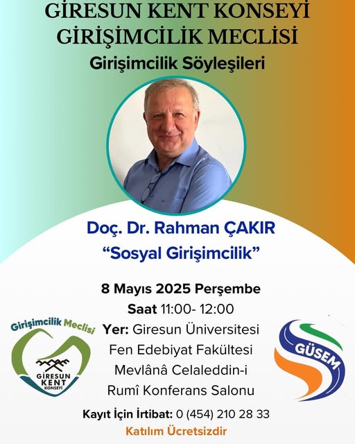 Giresun Ticaret ve Sanayi Odası Sosyal Meclisi, Giresun Kent Konseyi Girişimcilik Meclisi iş birliğinde anlamlı bir etkinliğe imza atıyor. “Girişimcilik Söyleşileri” başlığıyla düzenlenen program kapsamında, Doç. Dr. Rahman ÇAKIR katılımcılarla bir araya gelecek.